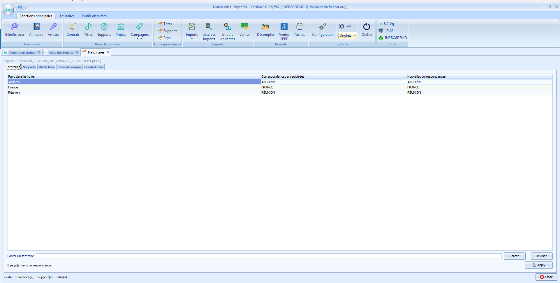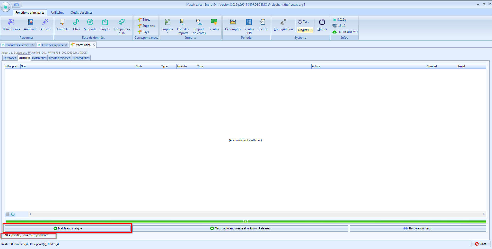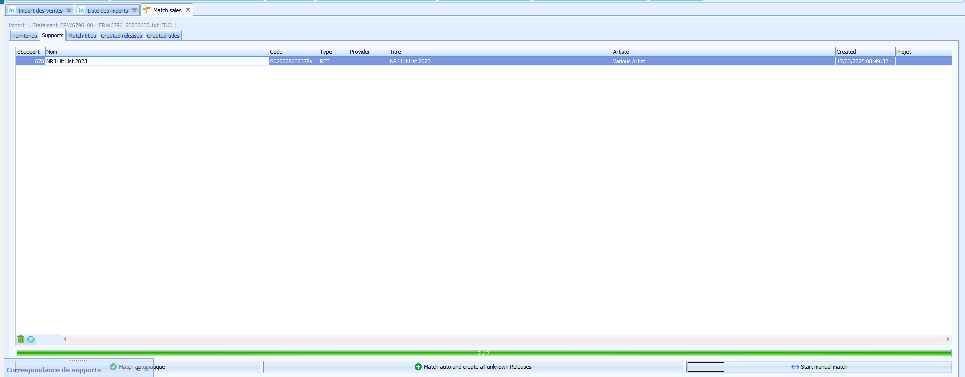 Toujours commencer par "Match automatique". Le système se basera sur les codes communs entre le fichier et la base de données pour matcher les supports et les titres.